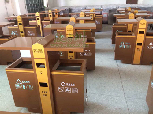 土豪金垃圾桶獨特設計風格F238戶外分類垃圾桶,外桶為足1.2mm鍍鋅板,表面噴塑工藝,內膽為201#,厚足0.75mm, 螺絲螺母為304不銹鋼材質,采用不銹鋼膨脹螺 安裝。噴塑顏色為土豪金色,垃圾桶開口位置坐折邊處理,箱體帶簡易防盜鎖。左右兩邊分別絲印,可回收物,其他垃圾等圖案標志。中間橙黃色區(qū)域,印有美的·鷺湖森林度假區(qū),廢電池光碟字樣,字體顏色為土豪金色。欣方圳工程師采用金色的獨特性的設計風格,特別受到物業(yè),房地產,機場,小區(qū)等單位的青睞。