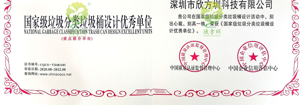 欣方圳獲得國家級垃圾分類垃圾桶設(shè)計優(yōu)秀單位,知識產(chǎn)權(quán)管理體系認(rèn)證,信息安全管理體系認(rèn)證,物聯(lián)網(wǎng)高新技術(shù)垃圾桶系統(tǒng)計算機(jī)軟件著作權(quán):基于物聯(lián)網(wǎng)技術(shù)的垃圾分類處理設(shè)備控制系統(tǒng)軟件、遠(yuǎn)程監(jiān)測系統(tǒng)軟件、環(huán)境監(jiān)測系統(tǒng)、智能管理系統(tǒng)平臺軟件