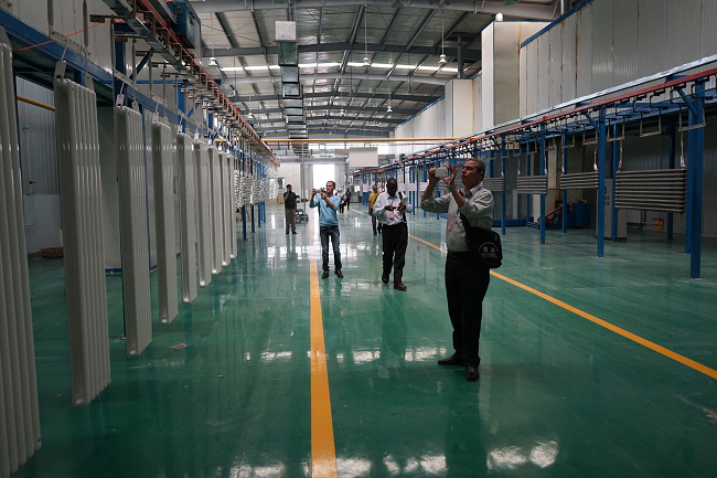 在集團(tuán)公司總裁吳繼祖陪同下,參觀團(tuán)先后深入到廠房和制造車間,對生產(chǎn)環(huán)境、工藝流程、主要設(shè)備、人員配備情況等進(jìn)行了參觀和了解。參觀團(tuán)一行對我公司新研發(fā)的輕型散熱器、平板集熱器、熱電聯(lián)產(chǎn)、PIC抑制熱傳導(dǎo)生產(chǎn)線等進(jìn)行了現(xiàn)場觀摩。他們在全方位了解公司的規(guī)模實(shí)力、研發(fā)實(shí)力及詳細(xì)的產(chǎn)品介紹后,高度贊揚(yáng)了公司產(chǎn)品的質(zhì)量和創(chuàng)新研發(fā)能力,對我公司的產(chǎn)品產(chǎn)生較大的興趣并期望今后與我公司能有合作機(jī)會(huì)。