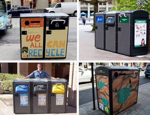 還有各種涂裝各種顏色,鋪主腦洞一開,要是在這垃圾桶上裝個(gè)顯示屏,是不是就變成了可視窗口?人流量那么大,賣廣告的話肯定也是無比的掙錢。
