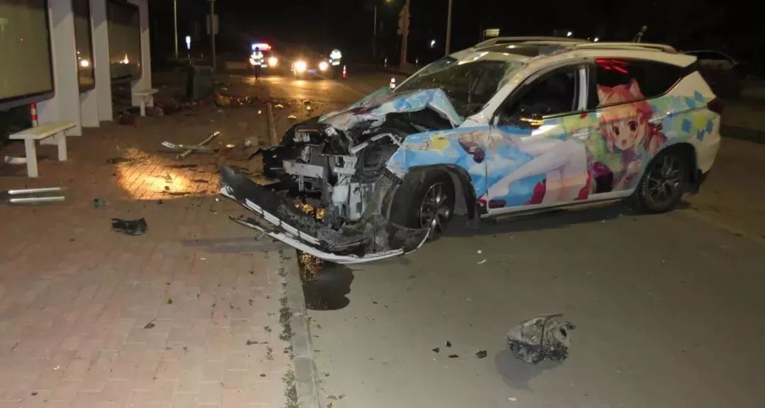萬(wàn)幸的是,車(chē)上的安全氣囊都及時(shí)打開(kāi)了,盡管車(chē)上四人嚇得魂飛天外,但身體都沒(méi)啥大礙,只有司機(jī)譚某的左手有些輕微擦傷。陳警官趕到現(xiàn)場(chǎng),只見(jiàn)一輛粵CT××33比亞迪小車(chē)打橫??柯愤叄艉婧娴睦隽艘坏?,垃圾桶倒在一邊,交通指示牌和警示樁也被撞得連根拔起,情況比預(yù)想的要嚴(yán)重得多。陳警官發(fā)現(xiàn),小車(chē)車(chē)前蓋和兩側(cè)車(chē)身貼滿了動(dòng)漫美少女貼膜,但由于撞擊,原本萌萌的美少女此時(shí)變得有些猙獰。