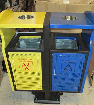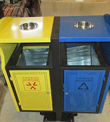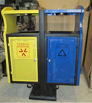 鋼制分類環(huán)保垃圾桶均選用優(yōu)質(zhì)的冷軋鋼板經(jīng)噴砂處理去油去銹后,鋼板表面抗紫外線丙稀酸油漆多層噴涂,沖孔通風效果好桶內(nèi)干爽防銹蝕。