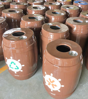 經(jīng)打磨、除塵、噴漆等一系列后期工藝然后出成品,表面光滑平整,仿木效果逼真,內(nèi)桶也采用玻璃鋼材質(zhì)制作,長期擺放于景區(qū)戶外抗老化更耐用,可單獨(dú)使用,也可多個組合擺放做分類垃圾桶!