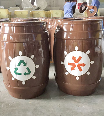 玻璃鋼仿木桶分類垃圾桶打造北海水樂園原生態(tài)景區(qū)