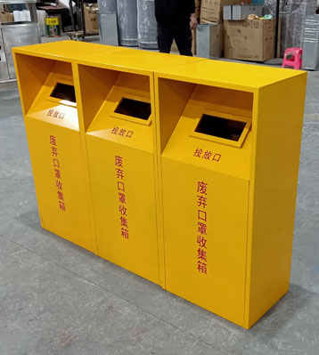 廢棄口罩垃圾桶回收箱整體方形黃色設(shè)計,用于疫情期間廢棄口罩垃圾產(chǎn)生量大收集處理,既美化了城市環(huán)境清潔,也有效阻斷病毒的傳播,開學校園需求量大。
