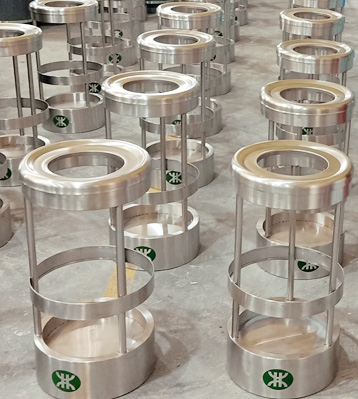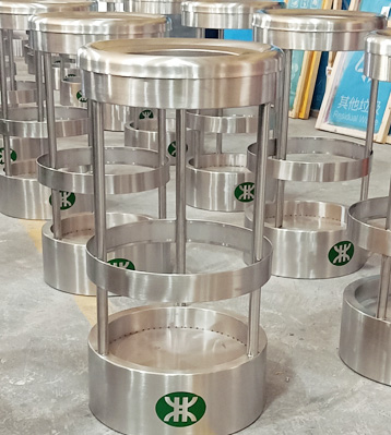 地鐵站簡(jiǎn)易套袋透明防爆果皮箱外觀圓形設(shè)計(jì),3根實(shí)心不銹鋼立柱等分與桶頭底座焊接成型,中間圓形包邊加固,可視設(shè)計(jì)垃圾存放情況一目了然。