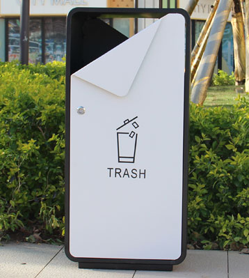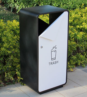 桶頭R角弧度防撞設(shè)計(jì),投口折紙創(chuàng)意設(shè)計(jì),使這款戶外果皮箱在城市擺放新穎時(shí)尚,黑白色調(diào)方形外觀可雙向果皮垃圾投放,不銹鋼烤漆戶外防銹升級(jí)耐用!